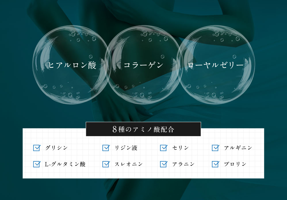 グリチルリチン酸ジカリウム、セリン、L-グルタミン酸、アラニン、リジン液、アルギニン、スレオニン、ブロリン、グリシン、DL-PCA・Na液、トリメチルグリシン、ヒアルロン酸ナトリウム(2)、加水分解コラーゲン(4)、ローヤルゼリーエキス、カワラヨモギエキス、クワエキス、カキタンニン、チャエキス(1)、カンゾウ抽出末、カモミラエキス(1)、オウゴンエキス、ビサボロール、濃グリセリン、ラウレス硫化Na、ヤシ油脂肪酸アミドプロビルベタイン液、ソルビット液、BG、乳酸Na液、塩化Na、安息香酸Na、EDTA-4Na、クエン酸、香料